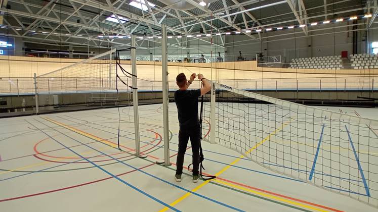 Het middenplein, met een indrukwekkende oppervlakte kan door netten onderverdeeld worden in 4 sportterreinen, waardoor meerdere sporten tegelijkertijd plaats kunnen vinden. We zijn ultramodern met bijvoorbeeld onze basketbalringen die met lasers vanuit het plafond op de juiste hoogte worden gehangen. Daarnaast kunnen we velden klaarzetten voor o.a. badminton, zaalvoetbal, volleybal, pickleball, enz.