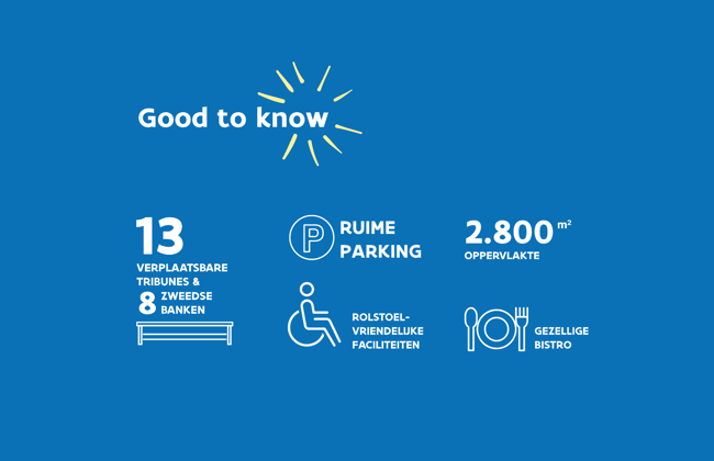 Kleedkamers en douches zijn natuurlijk inbegrepen in de huur. De locatie is vlot bereikbaar en ligt in de groene oase van Bolderberg, net langs Circuit Zolder.